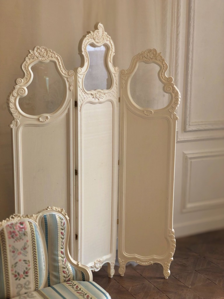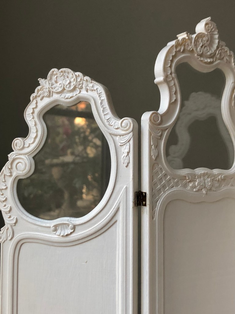 Inspired by 19th-century Rococo Revival mirrors, this trifold screen features elegant S-shaped scrollwork and delicate floral carvings, bringing a romantic touch of the Madame de Pompadour era to your doll studio.